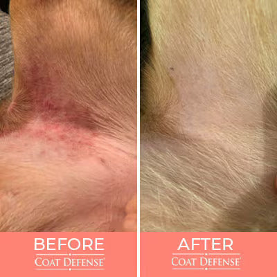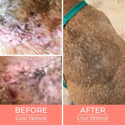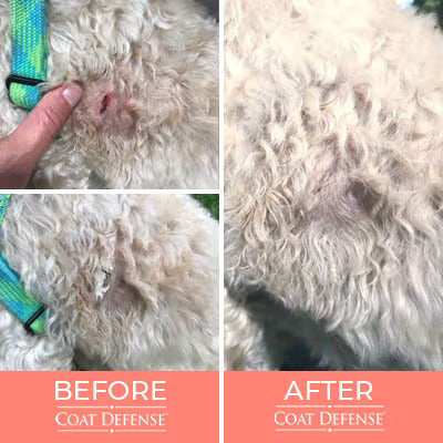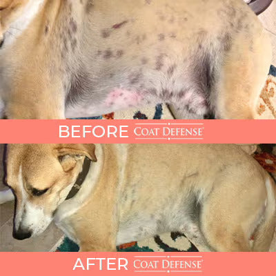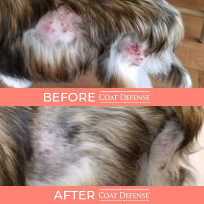 "Why I love and stand by Coat Defense ! I will forever use these products because they literally work instantly on my dog who has crazy allergies! Don’t need to say much I think these pictures speak enough for it! Hives/rash to nothing with hair grown back in just a few weeks!"