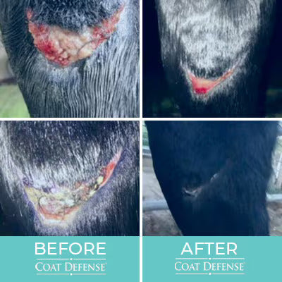 "I can not thank COAT DEFENSE® enough for their immediate response to my desperate seek for help! This could not have happened at a worse time! Rain, nasty mud and fear of a staph in stagnant water and unmucked stalls. I continued to clean and wrap and apply antibiotic ointment until I was overwhelmed with proud flesh, but in fear of exposing to the nasty elements at hand. COAT DEFENSE® rescued my horse! I’m so grateful. Within a day or two samples arrived at my home. I applied everyday or every other day to the affected areas and washed the wound with water and betadine as necessary. The results are excellent as you can see!!!! THANK YOU!"