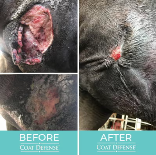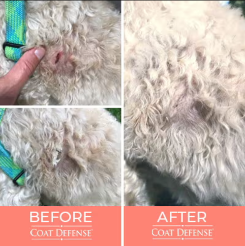 "Why I love and stand by Coat Defense ! I will forever use these products because they literally work instantly on my dog who has crazy allergies! Don’t need to say much I think these pictures speak enough for it! Hives/rash to nothing with hair grown back in just a few weeks!"