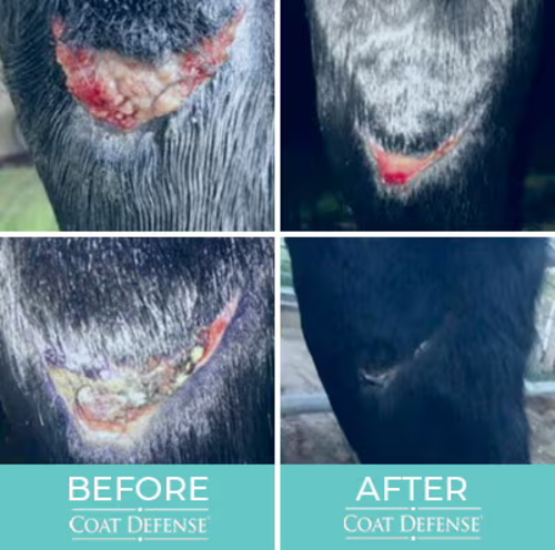 "I can not thank COAT DEFENSE® enough for their immediate response to my desperate seek for help! This could not have happened at a worse time! Rain, nasty mud and fear of a staph in stagnant water and unmucked stalls. I continued to clean and wrap and apply antibiotic ointment until I was overwhelmed with proud flesh, but in fear of exposing to the nasty elements at hand. COAT DEFENSE® rescued my horse! I’m so grateful. Within a day or two samples arrived at my home. I applied everyday or every other day to the affected areas and washed the wound with water and betadine as necessary. The results are excellent as you can see!!!! THANK YOU!"